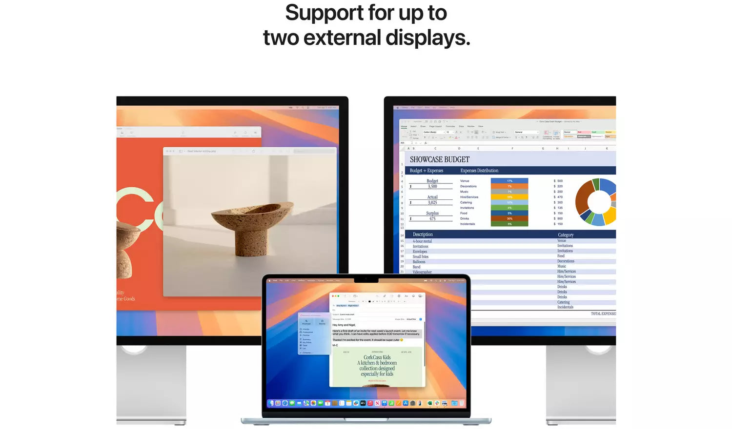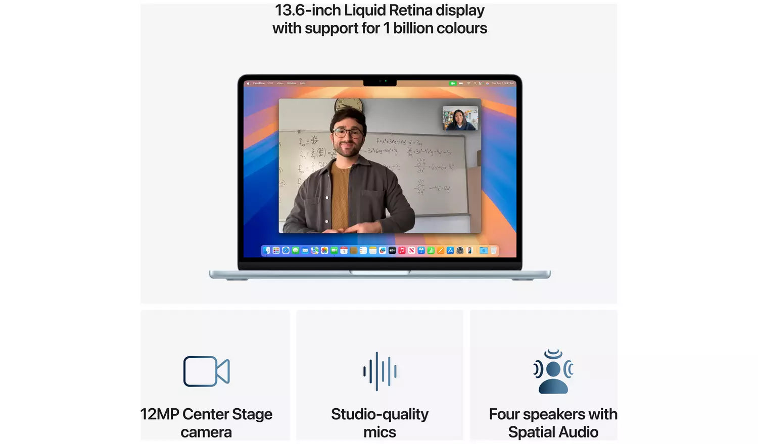 LOOK AND SOUND YOUR BEST - Everything looks and sounds amazing with a 12MP Centre Stage camera, three mics, and four speakers with Spatial Audio. CONNECT IT ALL - MacBook Air features two Thunderbolt 4 ports, a MagSafe charging port, a headphone jack, Wi-Fi 6E and Bluetooth 5.3. And it supports up to two external displays.