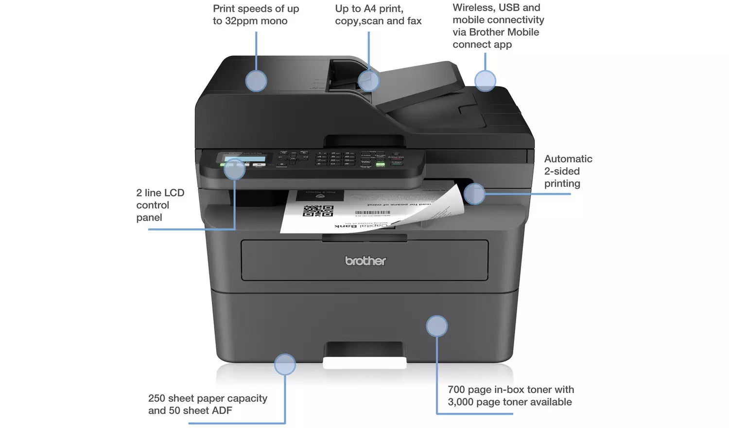 Work smarter from anywhere at home or in the office with the easily connected MFC-L2800DW. Hosting a range of efficiency-boosting features, this all-in-one mono laser printer saves you time with fast flawless printing and quick scan speeds, automatic 2-sided print, fax capability, a generous paper tray capacity and large automatic document feeder. Get set up with ease and download the Brother Mobile Connect App, enabling you to print and scan from virtually anywhere.