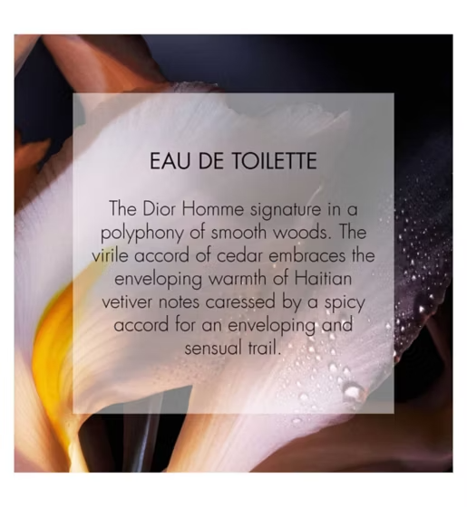 The NEW Dior Homme Eau de Toilette is intriguingly powerful and appealingly fresh. Dior Homme holds the promise of an intensely woody masculinity that envelops and enfolds, leaving a lasting impression.