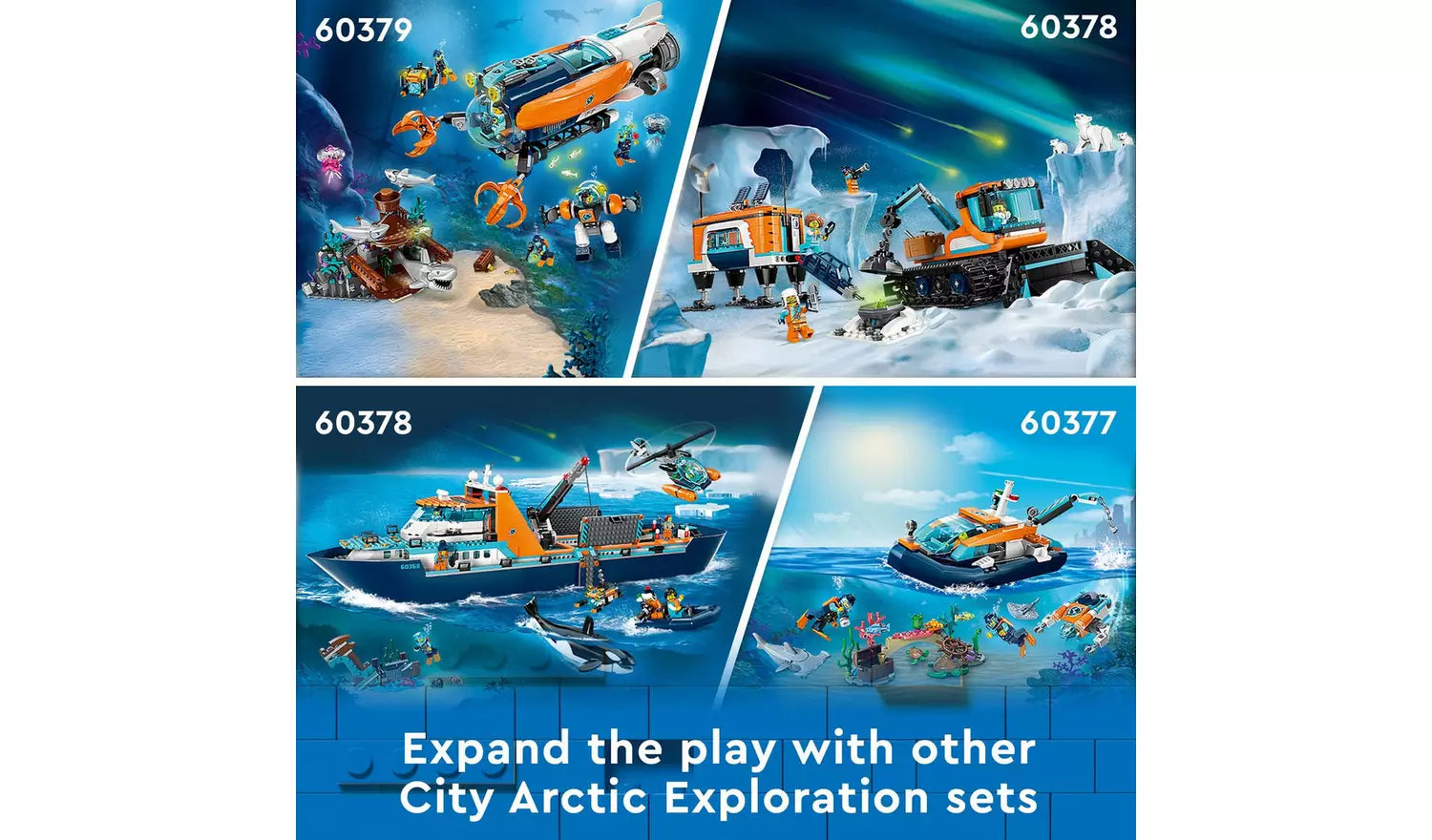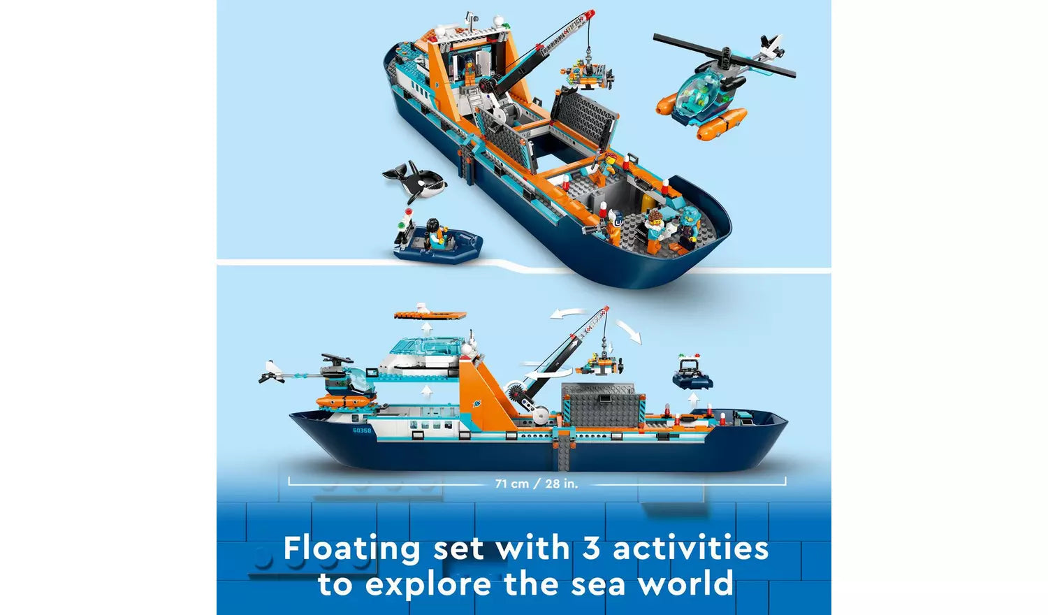 - LEGO City Arctic Explorer Ship features a large toy boat that floats on water, dinghy, ROV sub, Viking shipwreck, 7 minifigures and an orca figure.
