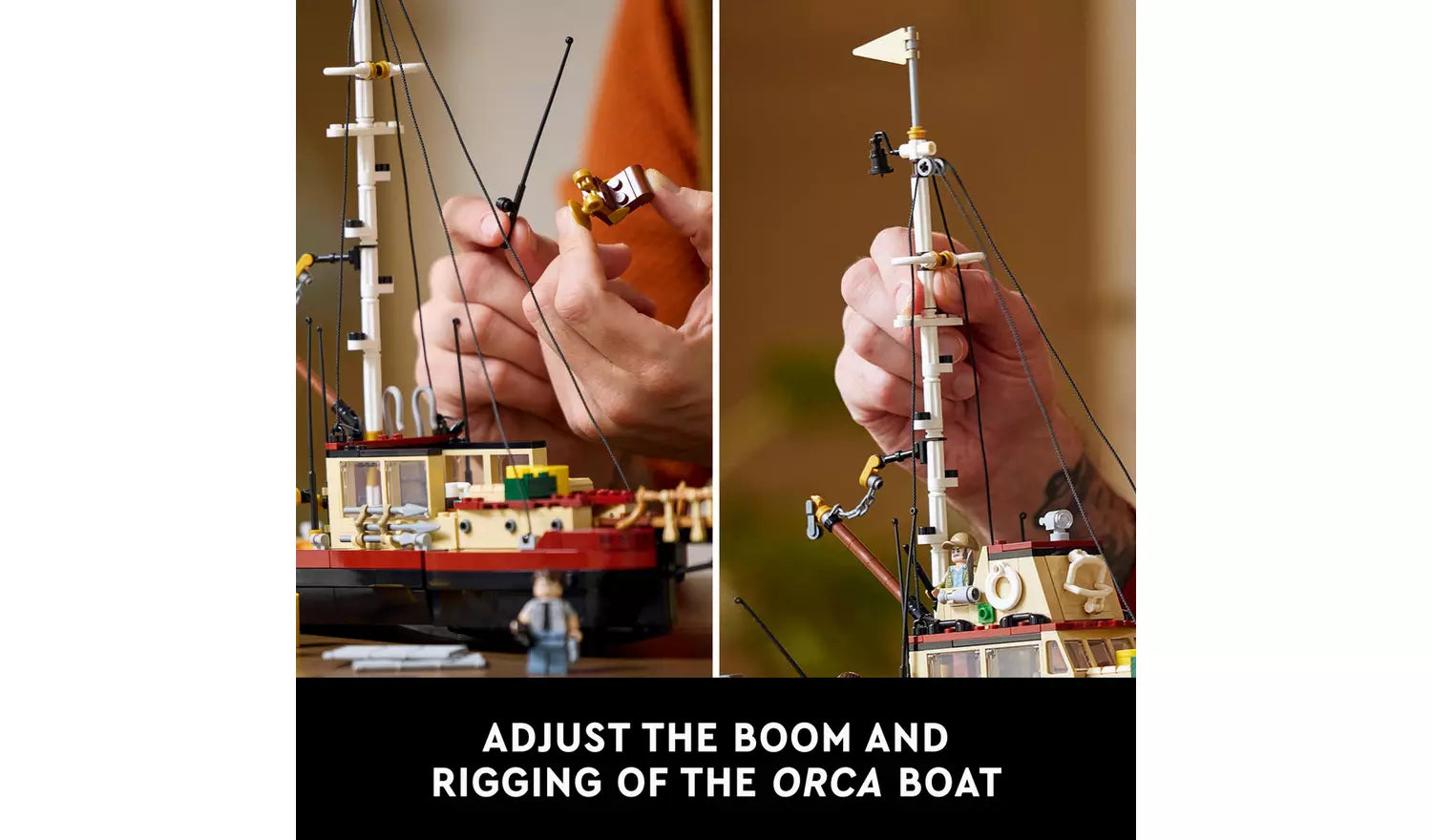 - Relive dramatic moments from a beloved film with the LEGO Ideas Jaws building set for adults (21350), a fun diorama kit for Jaws fans, classic film lovers or movie memorabilia collectors. The model kit for adults to build features the Orca LEGO boat model, which has a detailed cabin with a removable roof, an adjustable boom and rigging, plus lots of iconic accessories. The Orca boat model in this Jaws LEGO set measures over 35 cm (14 in. ) high, 59 cm (23 in. ) long and 20 cm (7.5 in. ) wide.