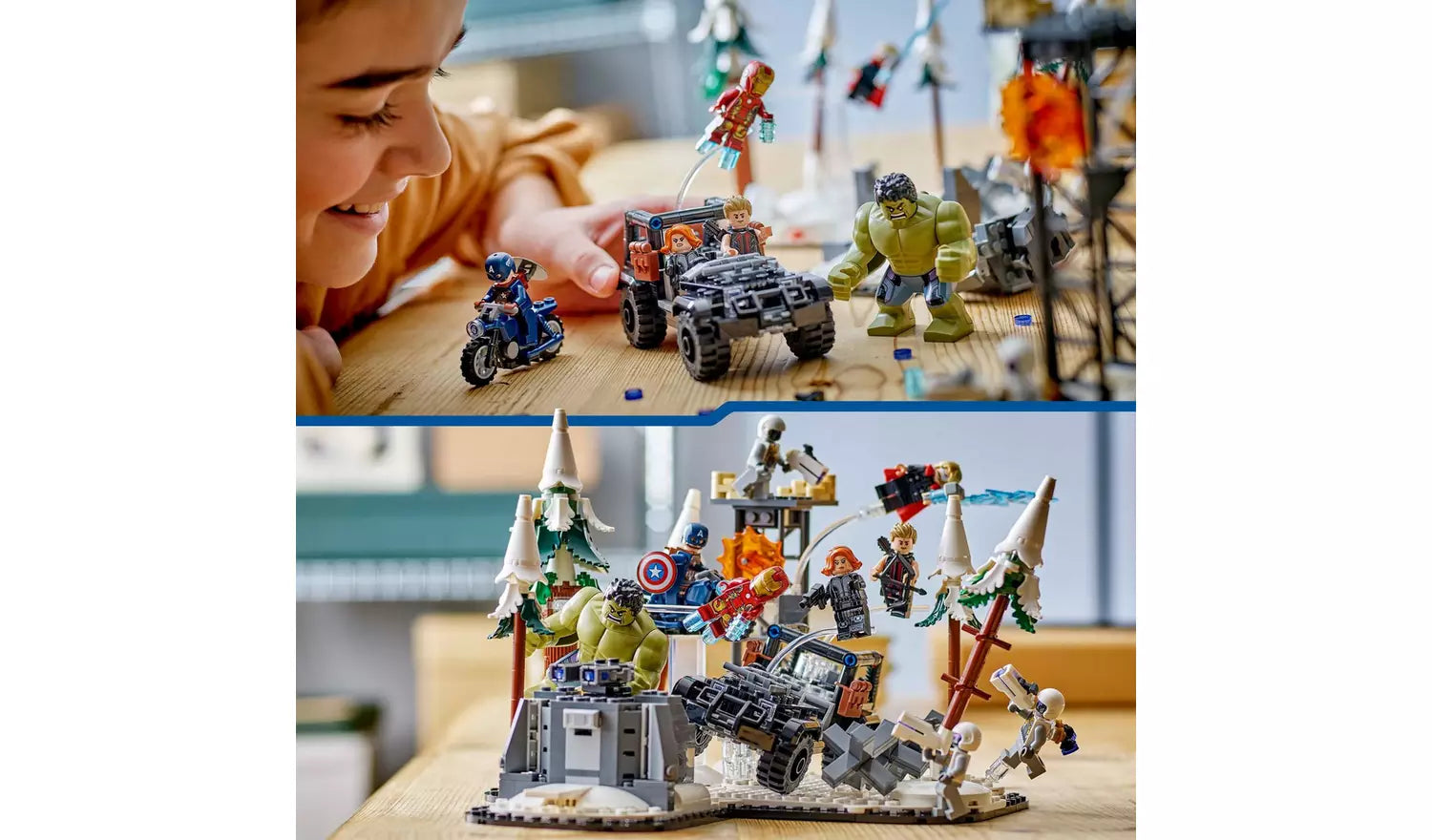 A mega, modular LEGO Marvel playset with Avengers minifigures, Hydra villain minifigures and Hulk in an epic Super Hero building toy gift for kids.