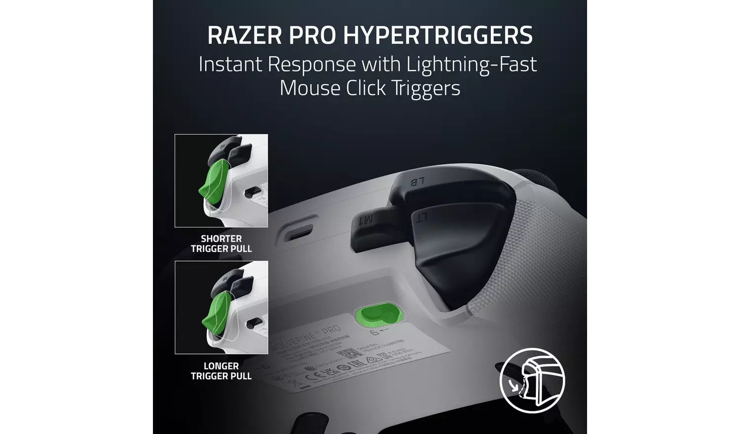 Razer Pro HyperTriggers Instant Response with Lightning-Fast Mouse Click Triggers. Set the triggers for instant actuation with zero-travel time or ultra-precise analog control. Be fully immersed in the action and feel every trigger pull with integrated haptic vibrations.
