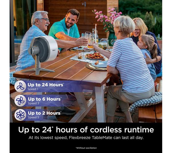 Keep your cool with this Shark FlexBreeze TableMate fan. You get up to 24 hours of cordless runtime or you can just plug it in for continuous power. You decide. Its quiet blades barely make a peep so it won't disturb you while you sleep. Use it all night and wake up in the morning as cool as a cucumber. And with five fan speeds, 180º oscillation and a 55º tilt, everyone can share the breeze. Now that's cool!