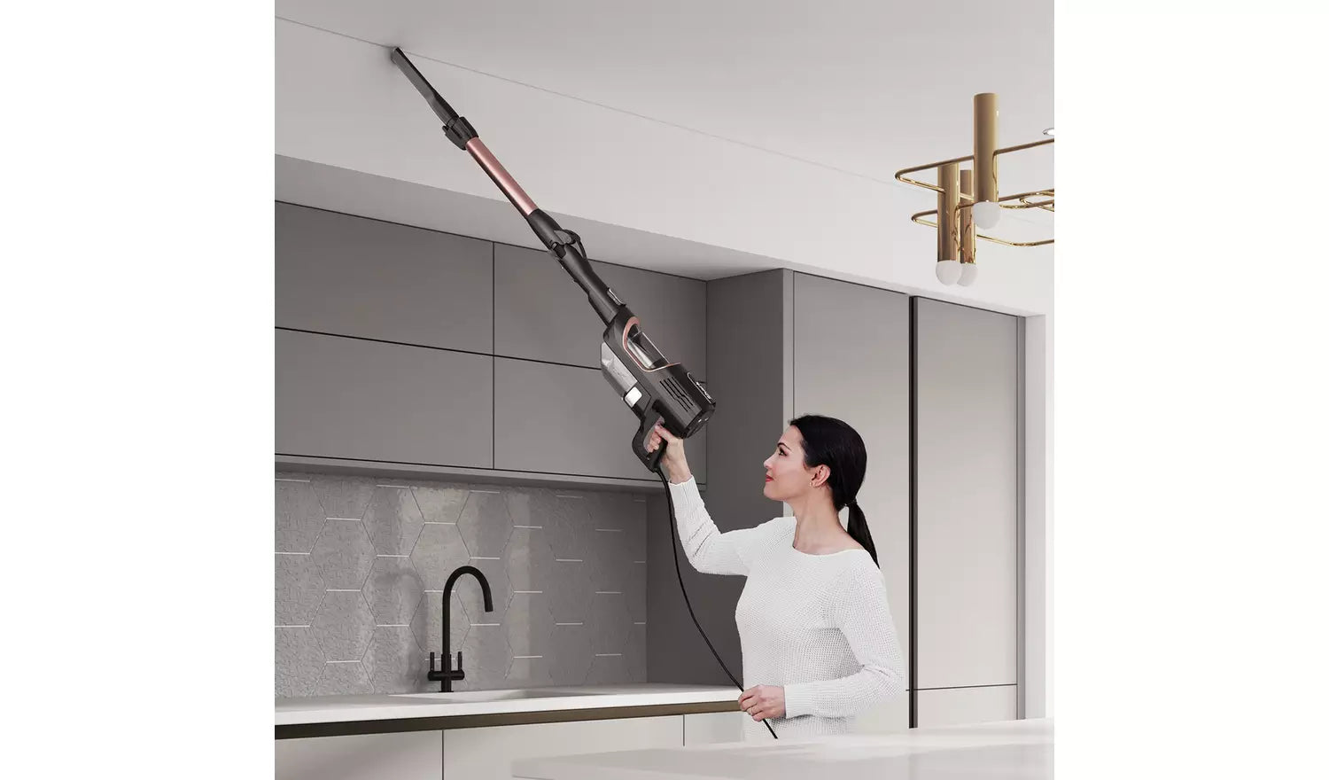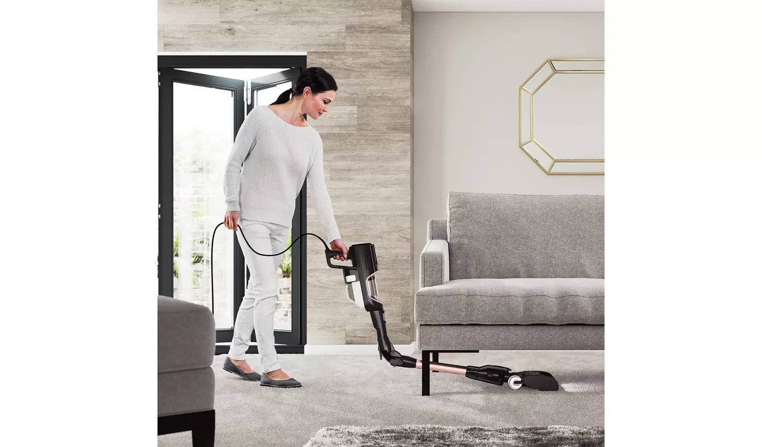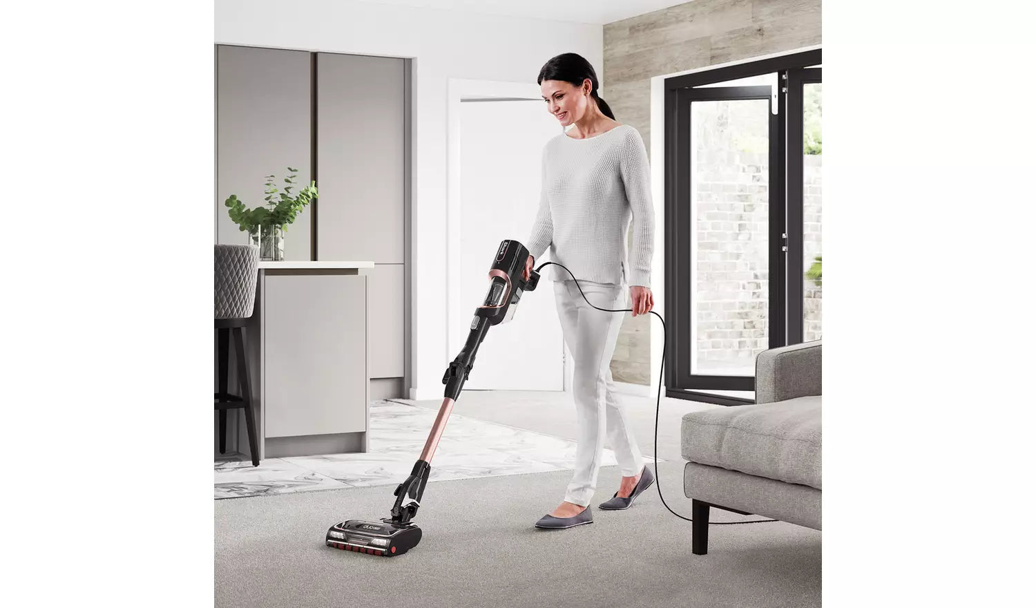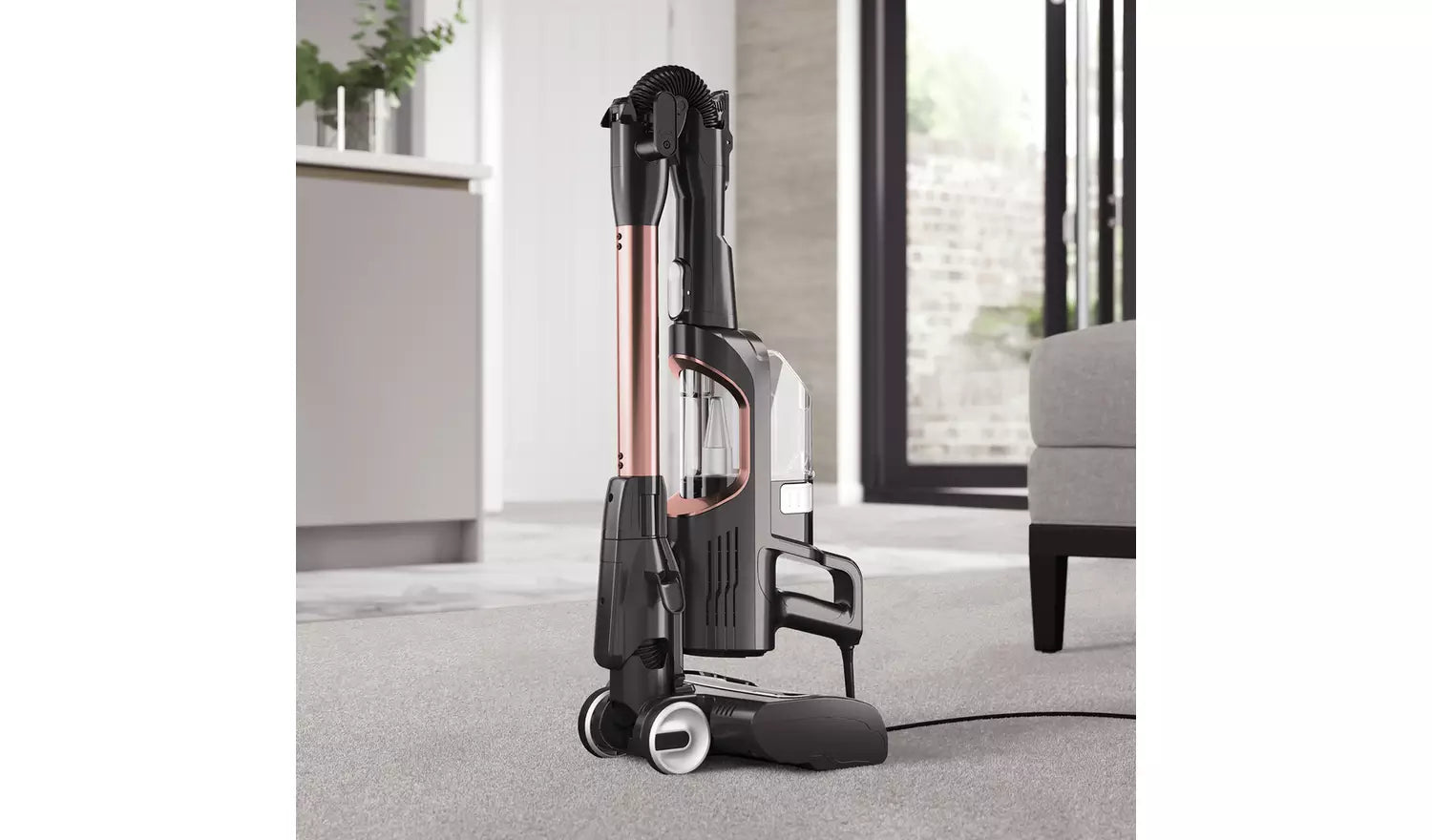 Flexology – Reach, clean and store anywhere. At the touch of a button, this flexible wand bends to easily clean under low-lying furniture with no need to lift it. Fold down for compact, freestanding storage.