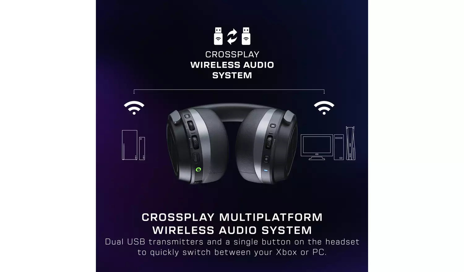 CrossPlay Multiplatform Wireless Audio System - Dual USB wireless transmitters and a single button on the headset allow you to quickly switch between your favourite console or PC without having to move transmitters or connect cables.